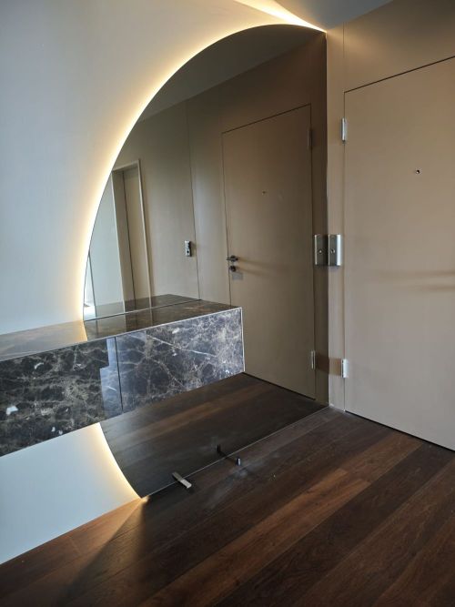 In Birmensdorf durften wir einen speziellen LED Spiegel anfertigen, der genau auf das Badezimmer und den vorhandenen Unterbau abgestimmt wurde. Der Spiegel hat einen Randausschnitt, damit er sich millimetergenau um den Unterbau legt. So entsteht ein sauberes und harmonisches Gesamtbild, das sowohl technisch als auch optisch überzeugt.
